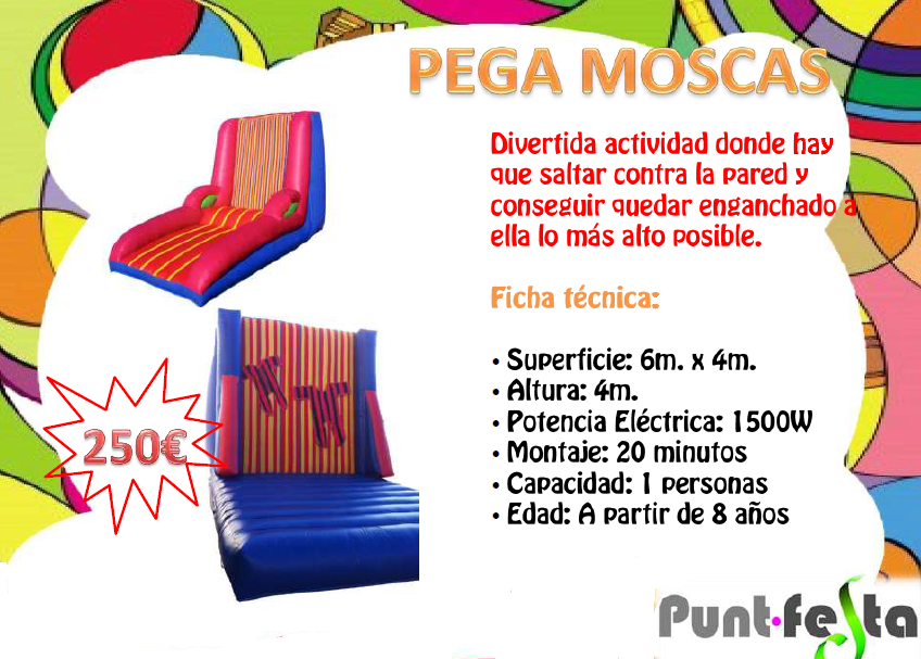 Divertida activitat on s'ha de saltar i quedar enganxat a la paret inflable, guanya qui queda enganxat el mes alt possible i mes temps.