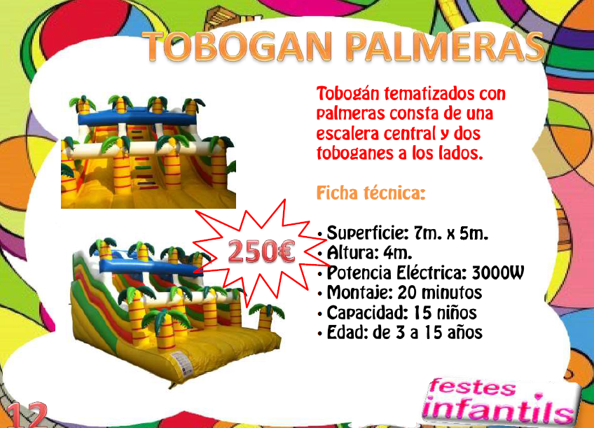 L'inflable tobogan palmeras, es un tobogan de dues pistes, per un gran volum de nens, una altre forma de divertir-se, els nens i nenes els hi encanta tirar-se des de ven a dalt, amb la total seguretat d'un tobogan inflable, tou i amb monitor especialitzat.
